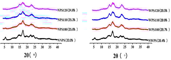 XRD confirmed that the starch crystallinity could be divided into A, B, and C types, and was affected by amylopectin content, average chain length, the orientation of the double helices to the X-ray beam, and crystallite size []. The X-ray diffraction patterns of the different samples and their corresponding relative crystallinity are shown in Figure 6, indicating that the two native samples contained B crystals. B-type X-ray profiles are commonly found in root starch, amylose-rich starch, cereal tubers, and some fruit seeds with peak intensities of 5.5°, 14.4°, 17.2°, 22.2°, and 24° []. The two native starches exhibited a peak value at 20°, indicating that the starch formed a V-type inclusion complex with lipids. At a diffraction angle of 5.5°, the strength of NNPS exceeded that of NWPS, while the same phenomenon was evident at 22°–24°. This may be due to the presence of type A unit cells in NWPS []. After HMT, the crystals of the two starches were transformed from B-type to A-type, while the relative crystallinity decreased gradually. The results were consistent with Tan []. NPS100 retained the weak characteristic B crystal peak. A weak diffraction intensity was apparent at 5.5°, with two less obvious peaks at 23°, while no peak was evident at 15°. As the reaction temperature increased, the partial characteristic B crystal peaks of NPS110 and NPS120 gradually disappeared. However, the characteristic type A intensity peaks at 15° and 23° were higher and more visible for the HMT starches, especially for NPS120. The peak at 5.5° of WPS100 disappeared, while that at 15° was more obvious. Kim [] believed that the decrease in peak intensity at 5.5° was due to crystal reorganization rather than the destruction of the double helical structure forming the crystal array. The intensity peak of WPS at 15° increased gradually as the reaction temperature increased. These phenomena indicate that WPS is more susceptible to HMT, corresponding with the results presented in Figure 1. Furthermore, WPS was more prone to pits and voids in the center of the polarized cross. The crystalline form of the two starches changed from B to A after HMT, indicating that the structure of the B crystalline form was unstable, with low heat tolerance and poor thermal stability. HMT transformed this into a more stable crystal form [].