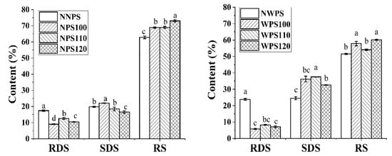 Starch digestibility is influenced by two factors. One is the ability of amylolytic enzymes to bind to starch granules, and the other factor concerns how many binding sites are present and how they are surrounded []. As shown in Figure 7, the RDS content in the NNPS was lower than in NWPS, while the RS level was higher, which may be related to the difference in amylose content in the two native starches. The amylose content is negatively correlated with the digestibility of starch []. After treatment, the RDS content in the two starches decreased, which was consistent with Yang []. It is likely that molecular chains adhere to an orderly packing after HMT that makes them less susceptible to enzymatic breakdown, as evidenced by the inhibited digestibility. In addition, the realignment is resistant enough to survive gelatinization. However, the RDS content showed a more significant decline in WPS than NPS, showing that HMT had an obvious impact on starch digestibility, additionally with a more substantial effect on that of WPS. Starch of higher amylopectin-to-amylose ratio is more sensitive to HMT, because steric hindrance near α-(1,6) glycosidic bond is weaker in comparison with that near α-(1,4) bond []. After HMT, dense double helix could protect starch glycosidic bonds from enzyme attack. The contact between amylase and starch molecules would become more difficult. which is in line with the previous XRD results. Compared with the native starches, the HMT samples displayed higher RS content, while the SDS varied according to the starch source and HMT temperature. WPS were more likely to form SDS after HMT. A debranched amylopectin chain may realign into an ordered region with structural rigidity, which increases enzyme resistance []. There is a possibility that SDS may yield due to interaction between external branch chains A and B1 that possess maximum DP ≥ 15.5 []. NPS were more likely to form RS after HMT. As presented in the literature, RS and SDS primarily comprise a (semi-)crystalline region formed by double helices whose DP is 13~24 []. Recombination of the starch molecules occurs preferentially in amylose or long chain amylopectin, which could promote RS formation []. Furthermore, the RS level increased at a higher temperature, while the SDS content reduced. This shows that starch after HMT under high temperature was more likely to form resistant starch, and after HMT under low temperature was more likely to form SDS. As a result, starch with different digestibility can be intelligently prepared by changing the process conditions or varieties in the future.
