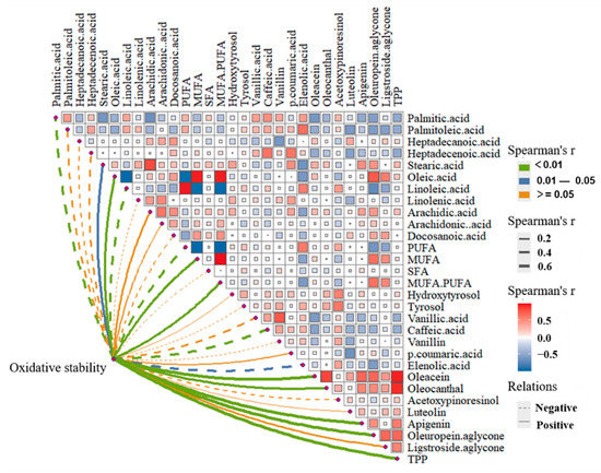 Spearman correlation analysis was applied to visualize the relationships between chemical parameters, and between chemical parameters and oxidative stability (Figure 2).