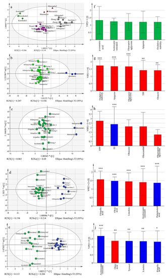 OPLS-DA models: ten varieties (a), ‘Koroneiki’ vs others (b), ‘Manzanilla’ vs others (c), ‘Ascolana tenera, Arbequina and Zhongshan24’ vs others (d), ’Ezhi8, Ulliri Bardhe, Empeltre, Yuntai14 and Picual’ vs others (e); summary of the first five variables of the important differential variables in each left separation group, respectively (f–j). Red indicates a higher level and blue indicates a lower level. Green does not involve in level expression. “***”, p < 0.001, “**”, p < 0.01, “*”, p < 0.05. 1 Extractability index (EI); total phenolic content (TPP).