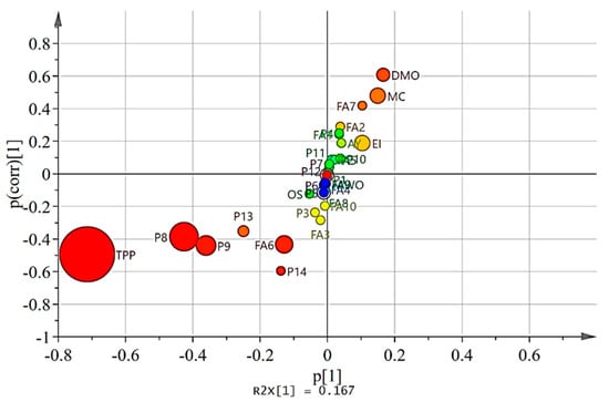 S-Plot providing the visualization of variables affected by maturity index. The circular size was positively correlated with the degree of influence. 1 Dry matter oil content (DMO); moisture content (MC); wet matter oil content (WMO); extractability index (EI); abencor yield (AY); palmitic acid (FA1); palmitoleic acid (FA2); heptadecanoic acid (FA3); heptadecenoic acid (FA4); stearic acid (FA5); oleic acid (FA6); linoleic (FA7); linolenic acid (FA8); arachidic acid (FA9); arachidonic acid (FA10); hydroxytyrosol (P1); tyrosol (P2); vanillic acid (P3); caffeic acid (P4); vanillin (P5); p-coumaric acid (P6); elenolic acid (P7); oleacein (P8); oleocanthal (P9); acetoxypinoresinol (P10); luteolin (P11); apigenin (P12); oleuropein aglycone(P13); ligstroside aglycone (P14); total phenolic content (TPP); oxidative stability (OS).
