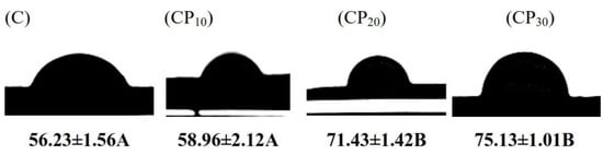 Water contact angle of various BSG samples; C, CP10, CP20, and CP30 indicate unmodified samples and those treated by CP for 10, 20, and 30 min, respectively. Different uppercase letters indicate significant differences (p < 0.05).