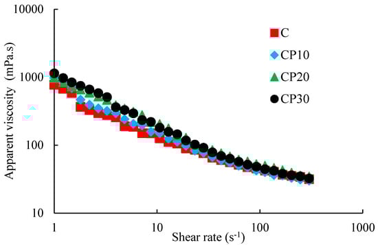 Changes in the apparent viscosity of different BSG dispersions (0.3%) at 20 °C as a function of shear rate; C, CP10, CP20, and CP30 indicate unmodified samples and those treated by CP for 10, 20, and 30 min, respectively.