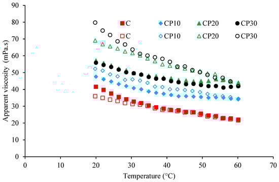 Changes in the apparent viscosity of different BSG dispersions (0.3%) at a constant shear rate of 50 s−1 as a function of temperature; C, CP10, CP20, and CP30 indicate unmodified samples and those treated by CP for 10, 20, and 30 min, respectively. Filled and open symbols represent heating and cooling steps, respectively.