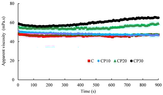 Changes in the apparent viscosity of different BSG dispersions (0.3%) at a constant shear rate of 50 s−1 as a function of time; C, CP10, CP20, and CP30 indicate unmodified samples and those treated by CP for 10, 20, and 30 min, respectively.