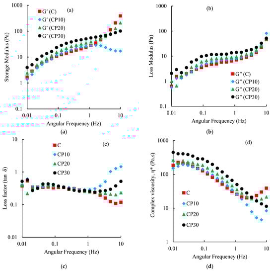 In gel systems, the loss modulus (G″) is smaller than the storage modulus (G′), while in dilute polysaccharide dispersions, G″ is always greater than G′. In concentrated polysaccharide dispersions and at low frequencies, G′ is dominant over G″, while at medium frequencies, these two moduli approach each other (i.e., cross-over occurs) [44,45]. As illustrated in Figure 7a,b, the G′ and G″ values of control and CP-modified BSG dispersions showed relatively similar dependency on frequency. BSG dispersions presented dominant elastic behavior (G′ > G′′) with no crossover (except for CP10) over the studied frequency range. Plasma treatment, particularly at longer treatment times, increased G′ values. The increase in viscoelastic parameters (G′ and G″) with the rise of treatment time was attributed to the formation of higher molecular interactions introduced in the FTIR section. There was a good agreement between the results of steady shear and dynamic tests. Amirabadi, Milani, and Sohbatzadeh [40] reported a similar effect of CP treatment on the rheological properties of gum Arabic. The loss factor results (or tan δ as the ratio of G″ to G′) are represented in Figure 7c. The values between 0.1–1 indicate the presence of weak gel structures [45]. Hosseini-Parvar [43] and Rafe et al. [46] similarly reported a solid-like behavior for native BSG dispersions. According to Figure 7d, complex viscosity (η*) was increased after CP modification, suggesting stronger and higher-ordered structures. In all samples, increasing angular frequency from 0.01–3.36 Hz reduced η* values that were attributed to the disruption of entanglements. This result is in good agreement with the results of shear-thinning properties. The consequence of network recovery and disruption might lead to various behaviors in the complex viscosity at the higher angular frequency (>3.6 Hz). The reduction of complex viscosity of native BSG in the range of 0.01 to 10 Hz was observed by Rafe and Razavi [47]. A similar behavior was also reported by Wei et al. [48] for fenugreek gum.