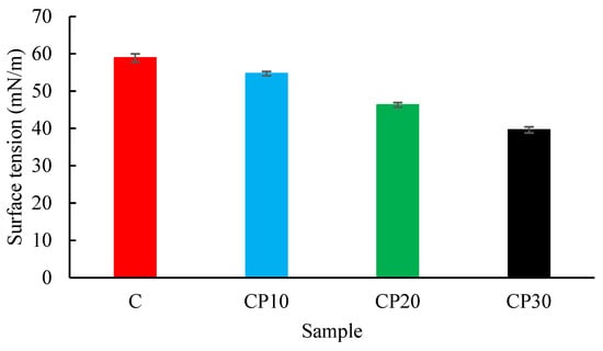 Changes in the Surface tension of different BSG dispersions (0.3%) at 20 °C; C, CP10, CP20, and CP30 indicate unmodified samples and those treated by CP for 10, 20, and 30 min, respectively.