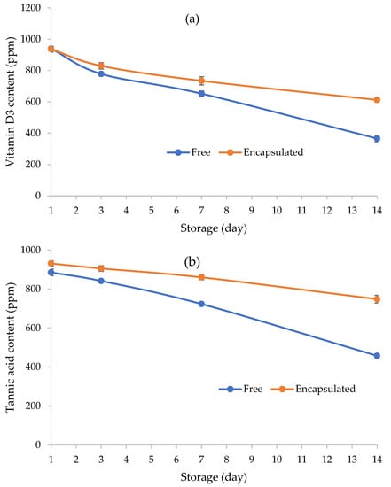 The stability of vitamin D3 (a) and tannic acid (b) in the modified BSG film in encapsulated form in nanophytosome and free form over storage time (day).