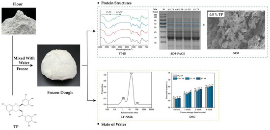 Briefly, 500 g wheat flour, 225 g ultrapure water (20–25 °C), and 5 g edible salt were mixed and kneaded at a low speed (4 min) and then a top speed (8 min) in a vertical two-speed dough mixer (H20F, Guangdong Lifeng Machinery Manufacturing Co., Ltd., Shenzhen, China) until the gluten network formed. The mixed dough was then allowed to stand for 30 min. The addition levels of TPs were 0% (control), 0.5%, 1%, and 2% of the flour weight. The dough was cut evenly into small pieces of 60 g each. After that, they were wrapped in polyethylene bags and stored at −18 °C for 0 to 4 weeks. The NFFD was then taken out at different storage times for analyzing the change in protein and water state; the scheme of the following works are shown in Figure 1.