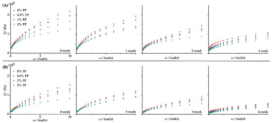 Effect of TPs on G′ (A) and G″ (B) of the NFFD (0.1–10 Hz frequency, 25 °C) at 0–4 weeks.