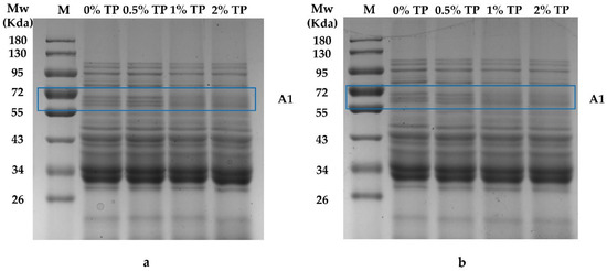 SDS-PAGE patterns of NFFD with 0–2% TP at 0 (a) and 4 (b) weeks. M, molecular weight of standard; A1, Area 1.
