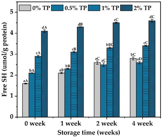 Sulfhydryl contents of gluten at 0 to 4 weeks, stored at −20 °C with various TP additions. Each experiment was carried out in triplicate. Values with different lower- or uppercase letters differ significantly among samples, either with the same frozen storage time or TP addition (p < 0.05).