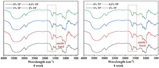 To further investigate the effect of TPs on protein structure in the NFFD, the FTIR spectra of dough samples with 0%, 0.5%, 1%, and 2% TP at both 0 and 4 weeks were recorded (Figure 5). In the meantime, the proportions of protein secondary structure were calculated through Peakfit based on the absorption peaks in the 1650–1660 cm−1 (α-helix), 1612–1640 cm−1 (β-sheet), 1662–1670 cm−1 (β-turn), and 1642–1648 cm−1 (irregular curl) regions.