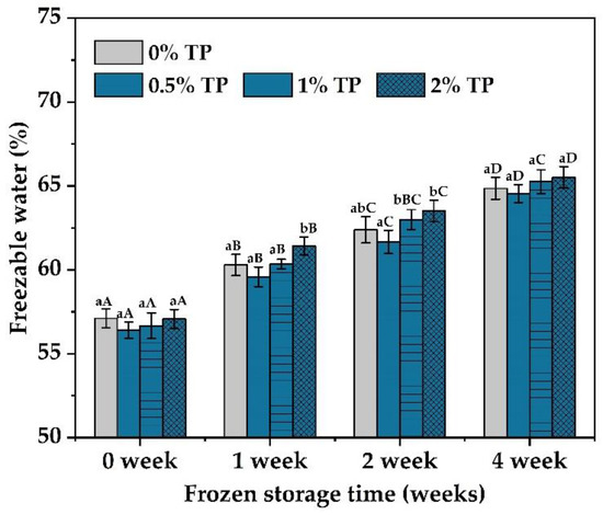 The freezable water content of NFFD (%, wet basis) in the presence of TPs (0–2%) at 0–4 weeks. Values with different lower- or uppercase letters differ significantly among samples either with the same frozen storage time or TP addition (p < 0.05).