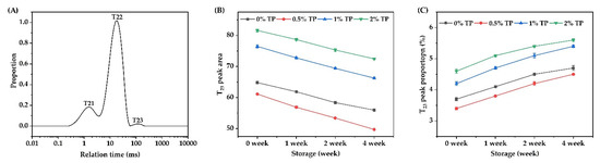 The water state and its distribution in the NFFD with TPs (0–2%) from 0–4 weeks were analyzed by using LF-NMR, and the results are shown in Figure 7. A typical T2 (transverse relaxation time) curve of NFFD was shown in Figure 7A, within which three proton populations, T21 (0.01–4 ms), T22 (4–75 ms), and T23 (75–205 ms), are represented for the bound water, immobilized water, and free water, respectively [32].