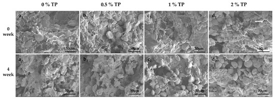 The fresh dough (0 weeks) without TPs showed a continuous and compact gluten network with starch granules embedded (Figure 8a1). By adding TPs (0.5%), the gluten network structure became denser and more ordered, leading to a more aggregated morphology of starch granules (Figure 8b1). The density of the gluten network could be caused by the interaction between TPs and gluten [37], which further resulted in the aggregation of starch granules. In addition, the hydrophilic nature of TPs might be another reason contributing to the tight binding to the gluten network [12].