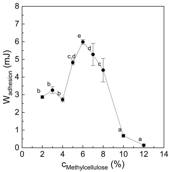Stickiness of methylcellulose hydrogels during probe tack test, as affected by concentration. Data points with different letters denote a statistical difference (p < 0.05).