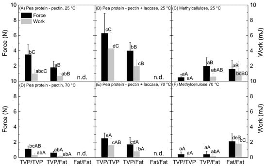 Maximum force and work during a tensile strength test of pea protein–sugar beet pectin mixtures (r = 2:1, 25% w/w, 100 mM NaCl) without laccase (A,D) and with laccase (B,E), and methylcellulose hydrogels (C,F) acting as binder between textured vegetable protein(s) (TVP) and/or fat mimetic (s) (Fat) at 25 °C and 70 °C. Data points with different small and capital letters denote a statistical difference (p < 0.05) within each temperature (impact of binder) and within each binder (impact of temperature), respectively. n.d. = not determined due to failure to apply the binder on the fat mimetic directly.