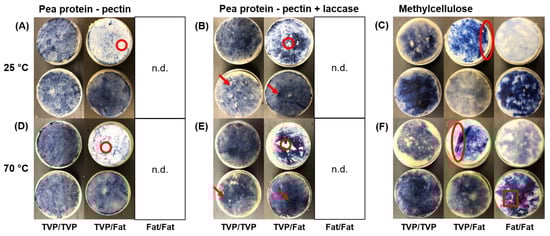 Images of pea protein–sugar beet pectin mixtures (r = 2:1, 25% w/w, 100 mM NaCl) without laccase (A,D) and with laccase (B,E), and methylcellulose hydrogels (C,F) acting as binder between textured vegetable protein(s) (TVP) and/or fat mimetic (s) (Fat) at 25 °C and 70 °C after tensile strength test. Red arrows indicate clusters of binder; red circles show failure of binder adhesion; red oval shapes indicate cohesive methylcellulose layer; and red squares show ruptured fat mimetic. Note that binder was dyed with brilliant black for better visualization. n.d. = not determined due to failure to apply the binder on the fat mimetic directly.