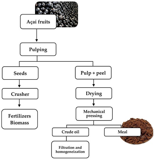 Açaí oil is extracted from the pulp and has been extensively used for cosmetic and pharmaceutical applications, whereas the pulp is the main value-added commercial product for exportation. However, to extract the pulp, large amounts of residues, mainly composed of seeds and peels, are generated and frequently discarded in the environment. The Brazilian Agricultural Research Corporation (EMBRAPA) indicates that açaí seeds account for 85% of the fruit weight as compared to 15% of the pulp (epicarp and mesocarp), which can be pressed for oil extraction or consumed with other food products [7]. The mechanical processing of açaí pulp for oil extraction generates a fiber-rich byproduct named meal, which is generally discarded in the environment as a residual material. This scenario may imply several environmental damages since the yield of the byproduct is higher than its usage [8], in addition to economic losses [9].