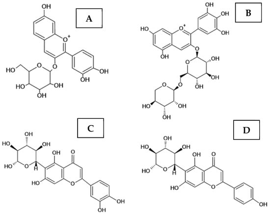 The structural formula of the main flavonoids identified in the açaí meal extract (Table 1). (A) = Cyanidin 3-O-glucoside, (B) = Delphinidin 3-rutinoside, (C) = 6-C-glycosyl luteolin (isoorientin), (D) = 6-C-glycosyl apigenin (isovitexin).