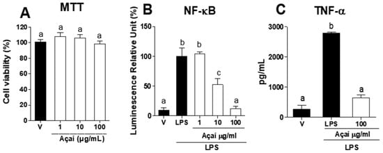 The inhibitory activity of the optimized açaí meal extract on NF-κB activation and TNF-α levels. (A) Viability of macrophages exposed to the extract at 1, 10, or 100 μg∙mL−1. (B) NF-κB activation in cells pretreated with the extract at 1, 10, or 100 μg∙mL−1 after stimulation with lipopolysaccharide (LPS) (10 ng∙mL−1) for 4 h. (C) TNF-α levels detected in the supernatant of cultures pretreated with the extract at 100 μg∙mL−1 after stimulation with LPS (10 ng∙mL−1) for 4 h. The data were expressed as mean ± SEM, n = 4. V—vehicle. Different letters indicate significant statistical differences (p < 0.05).