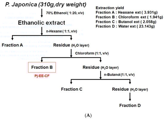 P. japonica was provided by the Prasiola japonica Research Center (Samcheok City, Gangwon-do, Republic of Korea). First, the dried sample was cut into 1 mm samples, and 70% ethanol was added at a ratio of 1:20 (w/v) to extract for 24 h. Then, the supernatant, excluding the precipitate, was filtered using a 110 nm filter paper (No. 2, Advantec, Toyo Co., Tokyo, Japan), and ethanol remaining in the solution was removed through a vacuum concentrator (Eyela New Rotary Vacuum Evaporator, Rikakikai Co., Tokyo, Japan). Finally, the sample was dried by a vacuum freeze dryer (Eyela FD1, Rikakikai Co., Tokyo, Japan) for 72 h [31,32]. The total sample weight was 310 g, the extracted amount was 33.143 g, and the yield was 10.69%. As shown in Figure 1A, the ethanol extract of P. japonica was fractionated using n-hexane, chloroform, n-butanol, and water. The yields of these preparations were 1.27% (hexane fraction), 0.63% (chloroform fraction), 0.67% (butanol fraction), and 7.47% (water fraction). The dried samples were stored in a −20 °C freezer.