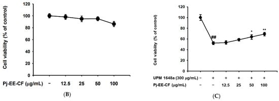 Human bronchial epithelial BEAS-2B cells were cultured in DMEM containing 10% FBS, 100 mg/mL streptomycin, and 100 U/mL penicillin at 37 °C in a 5% CO2 humidified incubator. BEAS-2B cells (5 × 104 cells/mL) were seeded in a 96-well plate and treated with Pj-EE-CF (0–100 μg/mL) for 24 h. To test the cytoprotective activity of Pj-EE-CF (0–100 μg/mL), we treated BEAS-2B cells with Pj-EE-CF and UPM 1648a (300 μg/mL) or UPM 1648a (300 μg/mL) alone for 24 h. A conventional MTT assay determined cell viability and cytoprotective activity [33,34].