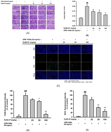 Pulmonary pathological alteration after UPM 1648a instillation and Pj-EE-CF administration in mice. (A) Representative image of the pathologic features of lung tissues prepared with five mice per group. Lung tissues from UPM 1648a and Pj-EE-CF treated mice were H&E stained. (B) Lung injury score of pulmonary tissue in each group. (C) A fluorescence microscopy image of macrophage and iNOS in lung tissue. Immunofluorescence was employed to assess macrophage infiltration (F4/80: red) and iNOS (green), and nuclei were stained with DAPI (blue). (D,E) Quantification of fluorescence intensity. Fluorescence intensities of F4/80 and iNOS were analyzed using Image J software and fluorescence intensities relative to control were calculated as percentage and expressed as mean ± SD.(F) Lung wet/dry (W/D) ratio in each group. The pulmonary water content was investigated by analyzing the lung W/D ratio. (G) Protein concentration in BALF prepared from UPM 1648a-exposed mice orally pretreated with Pj-EE-CF (25–100 mg/kg) was determined by the Bradford assay. All assays depicted in (A–G) were performed with five mice per group. Results (B,D–G) are presented as mean ± SD. # p < 0.05 and ## p < 0.01 compared to normal (non-treatment), * p < 0.05 and ** p < 0.01 compared to control (UPM 1648a alone).