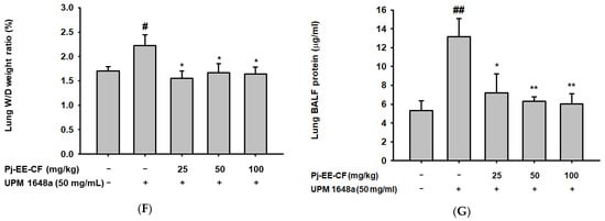 ICR mice (8 weeks old, male, 20–21 g) were purchased from Orient Bio (Sungnam, Korea) and bred at SKKU animal holding facility. Breeding facilities are pathogen-free, maintain a constant temperature (21–23 °C) and constant humidity (45–60%), and maintain a 12 h light/dark cycle. The mice were divided into five study groups, the control (vehicle) group, UPM1648a (50 mg/50 μL) group, and three groups representing UPM 1648a exposure (50 mg/50 μL) + PJ-EE-CF (25, 50, and 100 mg/kg), with five mice per group. The control mice were orally administered saline. UPM mice were intranasal administration with 50 μL of PBS containing 50 mg/mL UPM1648a for 3 days. For accurate intranasal administration, all mice were anesthetized just before intranasal administration. Mice in the UPM + PJ-EE-CF groups were given Pj-EE-CF (25–100 mg/kg) orally twice per day for three days, once an hour before UPM1648a treatment and once an hour after UPM1648a treatment. Mice were sacrificed after three days. BALF and lung samples were isolated. BALF was immediately collected, and all lobes of each lung were harvested. The collected BALF was used for ELISA analysis, and the largest left lobe of the lung was used for wet/dry ratio analysis. The middle and lower lobes were used for histopathological data, and the upper lobes were used for Western blotting. All animal experiments were performed in accordance with the guidelines established by the Institutional Animal Care and Use Committee (IACUC) of Sungkyunkwan University (IACUC No.: SKKUIACUC2021-04-12-1).