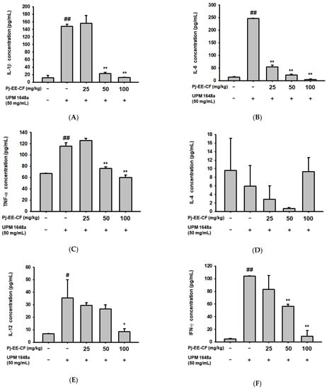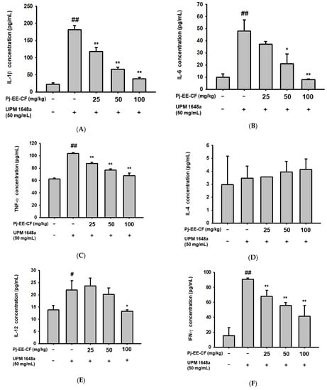 As in BALF, treatment with UPM 1648a significantly increased inflammatory cytokines (IL-1β, IL-6, TNF-α, 1L-12, and IFN-γ) in lung tissue. (Figure 4A–C,E,F). Consistent with the results in Figure 3D, IL-4 was not changed by UPM 1648a treatment (Figure 4D). Meanwhile, Pj-EE-CF (0–100 mg/kg) significantly suppressed amounts of IL-1β, IL-6, TNF-α, and IFN-γ in a concentration-dependent manner (Figure 4A–C,F) but did not affect IL-14 level (Figure 4D). In IL-12, only 100 mg/kg of Pj-EE-CF decreased UPM 1648a-induced IL-12 (Figure 4E).