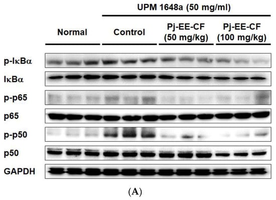 Regarding the luciferase reporter assays, baes-2b cells (2 × 105 cells/mL in 12-well plates) were transfected with 1 μg of plasmid-containing β-galactosidase and NF-κB-1-Luciferase reporter gene using lipofectamine 2000 (Thermo Fisher Scientific, Waltham, MA, USA). The cells were incubated with Pj-EE-CF (0–100 μg/mL) and UPM 1648a (300 mg/mL) or UPM 1648a (300 μg/mL) alone for 24 h. The cells were lysed using a cell lysis buffer reacted with luciferin to generate fluorescence, and then fluorescence was measured using a luminescence spectrophotometer. Normalization of the luciferase reporter assay was performed through the activity of β-galactosidase [38].