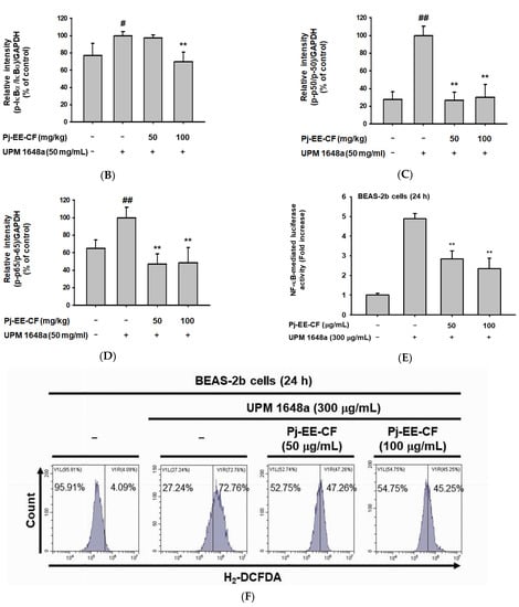 Inhibition of NF-κB signal by Pj-EE-CF. (A) Immunoblots of NF-κB signal molecules (Iκba, p65, p50) in UPM 1648a- and Pj-EE-CF-treated mouse lung tissues. Immunoblot images show all three biological replicates. NF-κB pathway-related molecules were detected using antibodies for total and phospho-forms of IκBα, p50, and p65. (B–D) Band intensity of the immunoblots was measured and quantitated through Image J software, and the relative intensity of the band is expressed as mean ± SD of the three biological replicates (n = 3 mice/group). (E) NF-κB luciferase assay in BEAS-2B cells treated with UPM 1648a (300 μg/mL) and Pj-EE-CF (0–100 μg/mL) or UPM 1648a (300 μg/mL) alone. Data in (E) are presented as mean ± SD of the three samples. (F) BEAS-2B cells were treated with UPM 1648a (300 μg/mL) and Pj-EE-CF (0–100 μg/mL) or UPM 1648a (300 μg/mL) alone and labeled with DCFDA. Fluorescence of DCFDA was detected by flow cytometry. # p < 0.05 and ## p < 0.01 compared to normal (non-treatment), ** p < 0.01 compared to control (UPM 1648a alone).