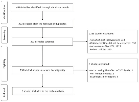 The flow and selection of studies from our search strategy are summarized in Figure 1. A total of 4284 studies were identified as eligible in the database search. Of these, 2238 studies remained after removing duplicates. After screening, 13 studies remained and were retrieved in full text, to be assessed according to the set exclusion and inclusion criteria. Of these 13 studies, 8 studies were excluded due to not assessing the effect of SDS levels, being non-human studies, or insufficient information. Thus, a total of 5 studies were involved in a meta-analysis to reveal the association between SDS consumption and reduction of glycemic responses, including EGI and GP.