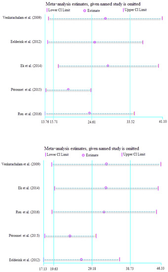 To further seek other possible sources of heterogeneity, an additional sensitivity analysis was conducted, where each study was excluded one at a time. Two works from Ren et al. [14] and Péronnet et al. [15] were responsible for the heterogeneity in the sensitivity analysis for EGI. When we withdraw the two studies, the heterogeneity dropped considerably (SMD = 17.23; 95% CI, 13.30–21.17; I2 = 14.6%, p = 0.31). For GP, high heterogeneity vanished when the works from Péronnet et al. [15] and Eelderink et al. [17] were excluded (SMD = 21.64; 95% CI, 16.86–26.43; I2 = 0.0%, p = 0.97).
