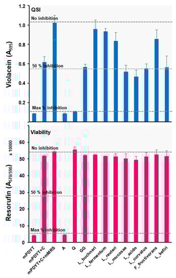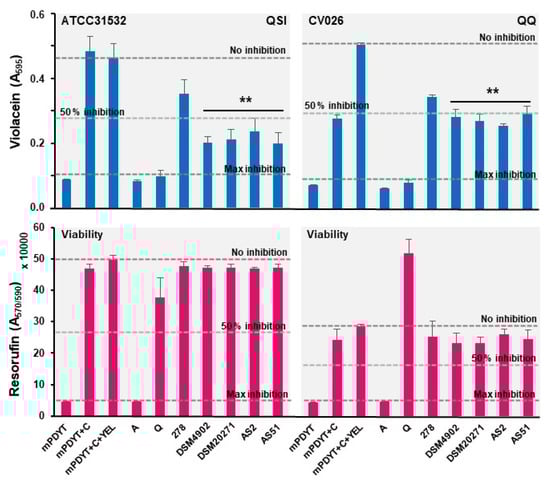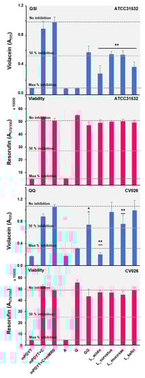 Figure 5. Anti-QS (blue) and bactericidal (pink) activities of the Lactobacillus and Propionibacterium cell-free supernatants against ATCC31532 and CV026. mPDYT, growth media; mPDYT+C, growth medium with ATCC31532 or CV026; A, azithromycin; Q, quercetin. Error bars, ± SD (n = 3–6). Changes in violacein synthesis in relation to mPDYT+C+YEL: **, p < 0.001. Grid lines, detected violacein levels with/without QS (Q) and bactericidal (A) inhibitors.