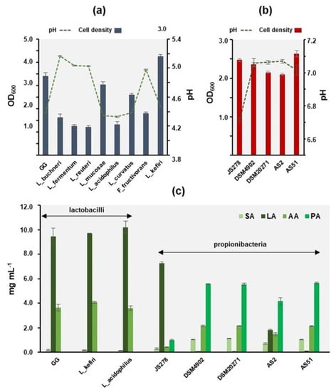 Figure 6. Cell density of the selected lactobacilli (a) and propionibacteria (b) at the timepoint of sample withdrawal and pH of the cell-free culture supernatants. (c) Concentration of key metabolic end-products secreted by the indicated lactobacilli and propionibacteria. SA, succinate; LA, lactate; AA, acetate; PA, propionate. Error bars ± SD (n = 4).