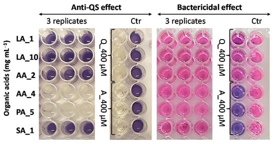 Figure 7. Anti-QS (blue versus colorless wells on the left) and bactericidal activity (pink versus blue wells on the right) of pure organic acids at the indicated concentrations (1–10 mg mL−1) against the C. violaceum ATCC31532 assessed in the 96-well format. LA, lactate; AA, acetate; PA, propionate and; SA, succinic acid. Quercetin (Q) and azithromycin (A) at 400 µM were used as anti-QS and bactericidal controls, respectively. Ctr, ATCC31532 cells with 10 µL of H2O were used as the positive control of an induced QS system and violacein production.