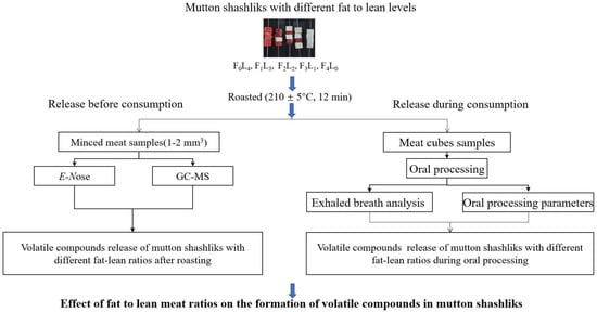 The aim of this work was to investigate the release of volatile compounds from mutton shashliks with different fat–lean meat ratios. Therefore, in this study, in addition to analyzing the volatile flavor compounds that can be released into the environment after roasting, the release of volatile compounds from mutton shashliks during oral processing is also emphasized. At the same time, by measuring the changes in the oral processing parameters of mutton shashliks caused by the different proportions of fat and lean meat, the reasons for the differences in volatile substances released in the oral cavity were deeply analyzed. This study could provide a comprehensive and clear understanding of the changes in the aroma release of mutton shashliks with different fat to lean ratios before and during consumption, providing a theoretical basis for improving the flavor of mutton shashliks.