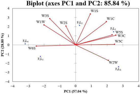 In this experiment, an electronic nose with ten sensors was used to obtain the odor information of different mutton shashliks. PCA is a statistical technique to reduce input data dimensions and is largely used for feature extraction []. It captures the relevant information in a set of input data and provides a lower dimension []. Principal component analysis can be used to analyze the electronic nose data, allowing an evaluation of the flavor attributes of shashliks with different fat–lean ratios []. As illustrated in Figure 2, the first principal component, PC1, was responsible for 57.04% of the total variation, while 27.80% of the total variance was explained by PC2. The total accumulative variance contribution rate of PC1 and PC2 was 84.84%, indicating that the first two principal components could explain the multi-index odor information of the vast majority of the samples. The figure shows that the distance between the four samples (F4L0, F3L1, F2L2, F1L3) was relatively far, indicating that different fat–lean ratios make the odor attributes of mutton shashliks vary considerably for the first principal component. F0L4 and F1L3 are located on the negative axis of PC1 and were mainly differentiated from the other samples by W6S. This suggested that the shashlik with a high proportion of lean meat (F0L4 and F1L3) contained more hydrogen compounds. When the fat proportion increased, the coordinate point of the samples transferred to the positive axis of PC1. The W2W, W5C, W3C, and W5S sensors provided stronger responses to the F3L1 and F4L0, which indicated that shashliks with a higher fat ratio (F4L0 and F3L1) would release more aromatic and organic sulfur compounds, short chain alkanes, alkane, and aromatics, ammonia and aromatic compounds, and nitrogen oxides. In the PC2, the W1W, W1S, W1C, W3S, and W2S sensors provided stronger responses to the F2L2 compared with F1L3 and F4L0, which suggested that the F2L2 contained more terpenes, inorganic sulfur compounds, methyl compounds, aromatic compounds, long-chain alkanes, alcohols, and carbonyls (aldehydes and ketones). Liu [] also reported that the predominant odors of roasted lamb contained aldehydes, ketones, and alcohols by flash GC E-Nose. The electronic nose test shows that there are significant differences in the information of the volatile compounds of mutton shashliks with different fat–lean ratios.
