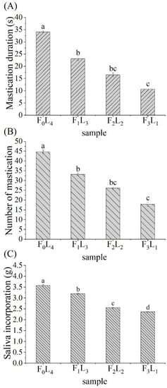 Oral processing parameters of shashliks with different fat–lean ratios, including mastication duration (A), masticatory number (B), and saliva incorporation (C). Different letters indicate that there is significant difference (p < 0.05). F0L4 represented the mutton shashliks with 4 lean cubes; F1L3 represented the mutton shashliks with 1 fat cube and 3 lean cubes; F2L2 represented the mutton shashliks with 2 fats cubes and 2 lean cubes; F3L1 represented the mutton shashliks with 3 fat cubes and 1 lean cube. Error bars represent S.E.M (standard error of mean).