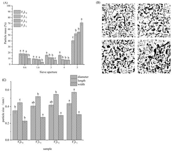 The particle mass percentage retained on the sieves with different aperture sizes (0.6–5 mm) is presented in Figure 3A. More than half of the particles were stained on the sieve with the largest aperture (5 mm), especially F3L1, which had an interception rate of 71.12%, which was significantly heavier than F2L2 (55.3%), F1L3 (52.47%), and F0L4 (40.52%). This result indicated that shashliks with a high fat level had larger particles after oral processing. However, particle breakdown was significantly higher in the samples with a large proportion of lean meat, and most of the fine particles were intercepted on the smaller-aperture sieves (0.6–4 mm). For example, the mass percentage of F0L4 particles retained on the sieves with 0.6 mm, 1.6 mm, and 3 mm aperture sizes was 1.79 times, 2.50 times, and 2.16 times that of F3L1, respectively. This might be because the meat cubes with a higher proportion of lean meat have been thoroughly chewed during oral processing, resulting in thinner muscle fibers that can more easily pass through the larger sieve apertures.