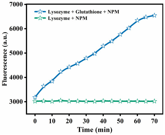 NPM is a fluorescent reagent that is frequently utilized in the detection of derivatives of compounds containing thioamides [13]. The curve of NPM fluorescence intensity over time is presented in Figure 1. The fluorescence was significantly enhanced in the presence of GSH and reached its peak at nearly 70 min, while the fluorescence intensity of natural Lys remained unchanged. This could also be because GSH may have broken the disulfide bond between Lys and released free sulfhydryl groups, which was the cause of a significant increase in the fluorescence strength at 380 nm [14].