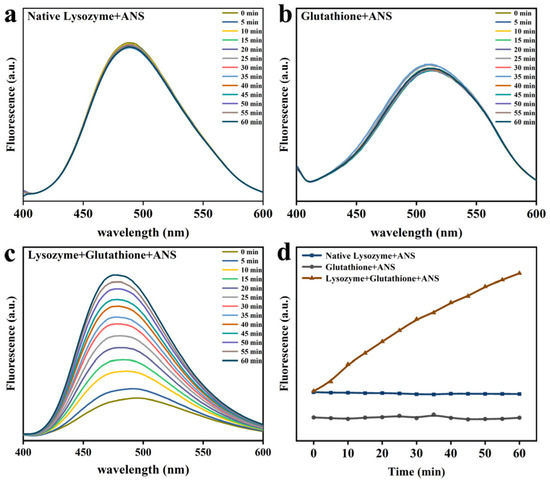 The ANS fluorescence assay for native Lys (a), GSH (b), Lys and GSH (c) at different incubation times. (d) The change of ANS fluorescence intensity for native Lys, GSH, and partially unfolded Lys as a function time of the reaction time.