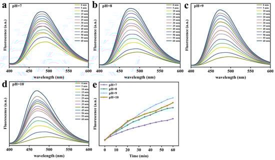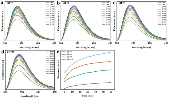 The Trp fluorescence intensity characteristic of Lys upon mixing the Lys buffer with GSH buffer at different pH values. (a) pH 7. (b) pH 8. (c) pH 9. (d) pH 10. (e) The change in Trp fluorescence intensity at 340 nm as a function of the reaction time at four different pH values.
