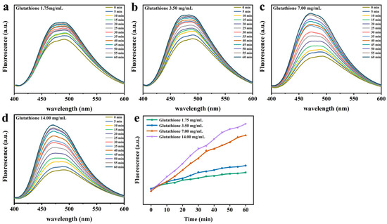 ANS fluorescence intensity characteristic of Lys upon mixing the Lys buffer with GSH buffer at different concentrations. (a) 1.75 mg/mL. (b) 3.5 mg/mL. (c) 7 mg/mL. (d) 14 mg/mL. (e) The change in the ANS fluorescence intensity at 475 nm as a function of the reaction time at four different concentrations of the GSH buffer.