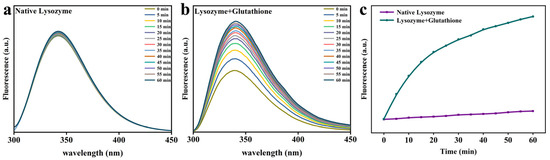 Intrinsic tryptophan fluorescence assay for native Lys (a), Lys and GSH (b) at different incubation times. (c) The change of Intrinsic tryptophan fluorescence intensity for native Lys and partially unfolded Lys as a function of the reaction time.