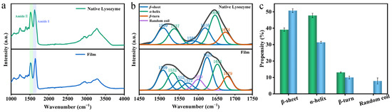 FTIR characteristic of the Lys nanofilm. (a) Comparison of the IR peaks between nanofilm and native Lys. (b) FTIR peaks of amide I and amide II of nanofilm, showing the deconvoluted β-sheet band. (c) Propensity analysis of the secondary structure of nanofilm and native Lys.