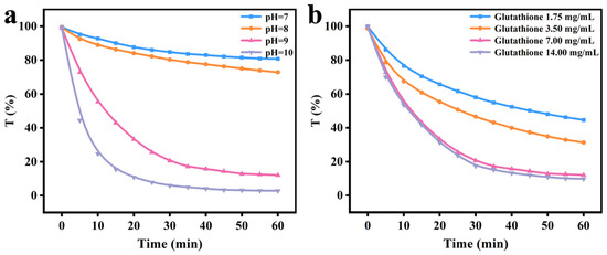 Spectrum of turbidity at 590 nm (transmittance %) as a function of the reaction time at four different pH values (a) and GSH concentrations (b).