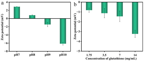 Effect of pH value (a) and GSH concentration (b) on the colloidal zeta potential in the solution incubated at 25 °C.